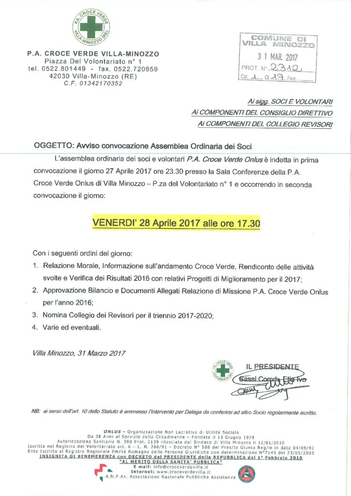 L’assemblea ordinaria dei soci e volontari P.A. Croce Verde Onlus è indetta in prima convocazione il giorno 27 Aprile 2017 ore 23.30 presso la Sala Conferenze della P.A. Croce Verde Onlus di Villa Minozzo – P.za del Volontariato n° 1 e occorrendo in seconda convocazione il giorno: