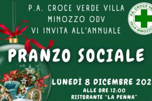 PRANZO SOCIALE CROCE VERDE VILLA-MINOZZO Domenica 8 Dicembre 2025!!! Il Pranzo Sociale Croce Verde è aperto ai Volontari del Soccorso, ai Soci, alle famiglie e alla comunità villaminozzese e a tutti i simpatizzanti della nostra amata Croce Verde Villa Minozzo. Un momento di condivisione dei valori del volontariato nello spirito del Natale. apri qui la locandina dell'evento Menù: Cappelletti in brodo Tortelli verdi Arrosti misti Patatine fritte Insalata Dolci della Casa Acqua, bibite, vino, caffè! Menù fisso al prezzo di € 30 Segnalate anticipatamente eventuali intolleranze alimentari. . Programma della giornata: ore 12.00 Ritrovo presso il Ristorante “La Penna”…