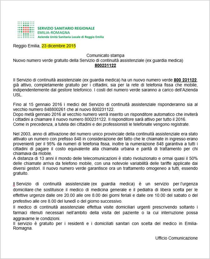 Fino al 15 gennaio 2016 i medici del Servizio di continuità assistenziale risponderanno sia al vecchio numero 848800261 che al nuovo 800231122.
